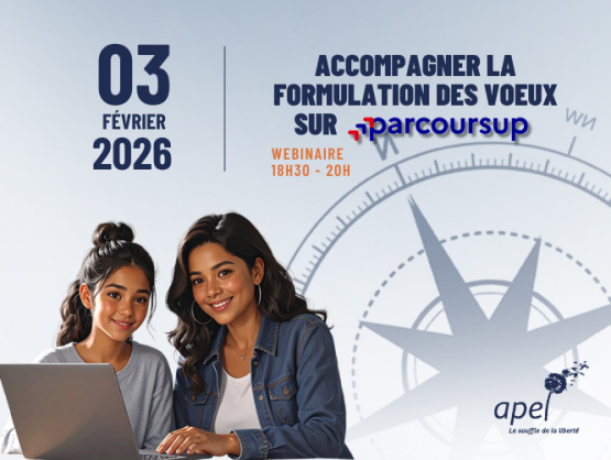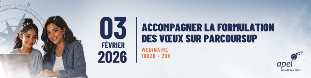 Présenté par Mme Laure COQUELET, membre du bureau national de l’Apel et animé par M. Jérôme TEILLARD, chef de projet Parcoursup au ministère de l’Enseignement supérieur, ce webinaire vous permettra de connaître et comprendre les principes clés de la formulation des vœux sur Parcoursup, de bénéficier de conseils pratiques et de découvrir les nouveautés 2026 proposées par la plateforme. Pendant le webinaire, un tchat vous permettra de poser vos questions en direct. Si vous ne pouvez pas assister au webinaire en direct, le replay est toujours disponible quelques jours plus tard sur le site apel.fr.
